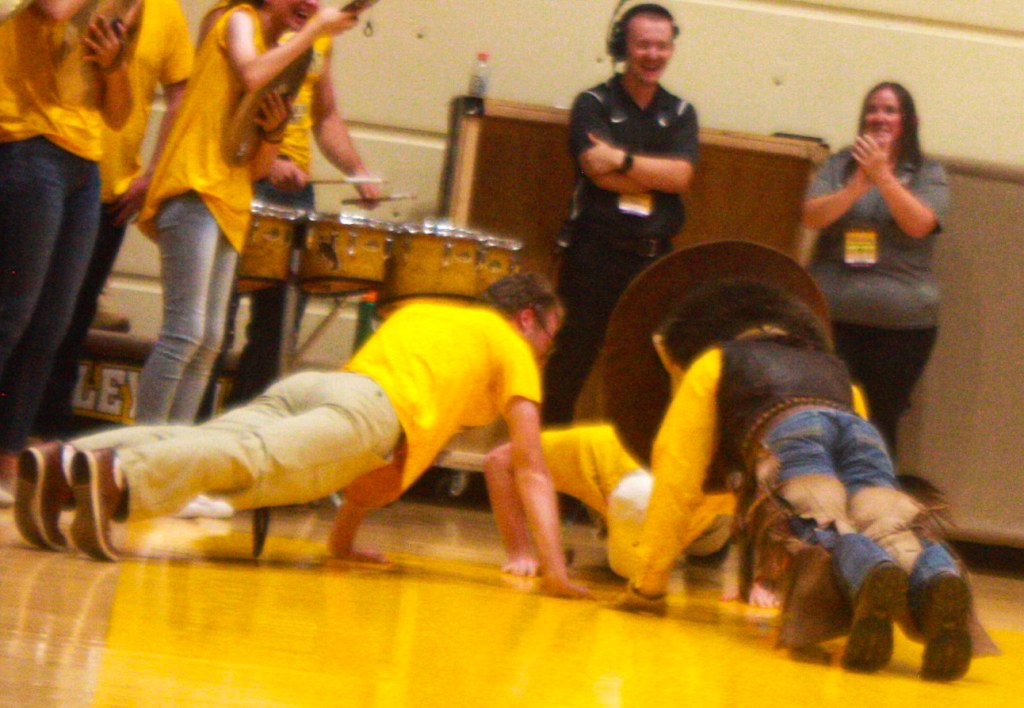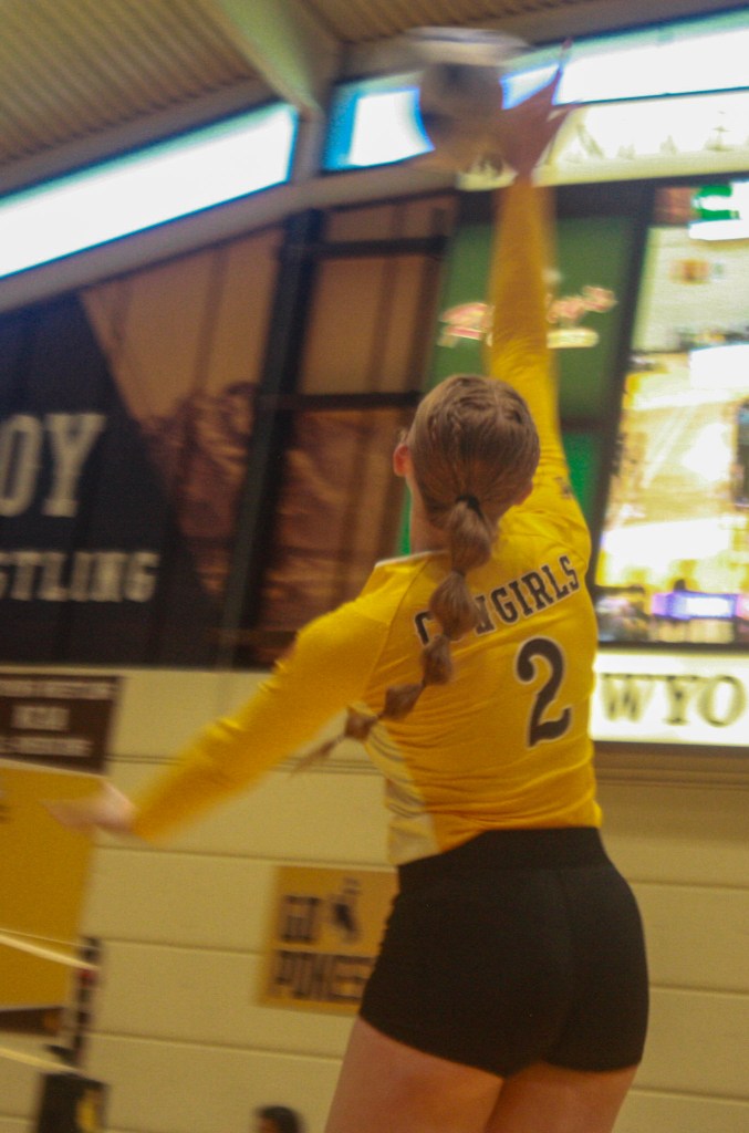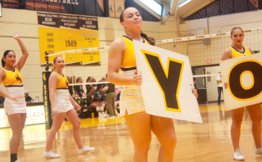 University of Wyoming mascot Pistol Pete, celebrating a Wyoming point at a Wyoming volleyball game at the UniWyo Sports Complex on September 16, 2023. Fans take great pride into their sports at the University of Wyoming. This is a great time for people to get together with old friends and getting to know new ones and Laramie has one of the few spots in the state of Wyoming where people can support athletics in a unique way.