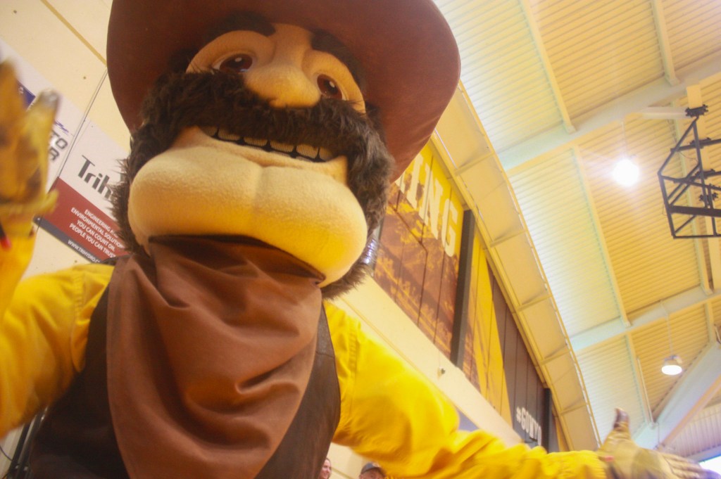 University of Wyoming mascot Pistol Pete, celebrating a Wyoming point at a Wyoming volleyball game at the UniWyo Sports Complex on September 16, 2023. Fans take great pride into their sports at the University of Wyoming. This is a great time for people to get together with old friends and getting to know new ones…