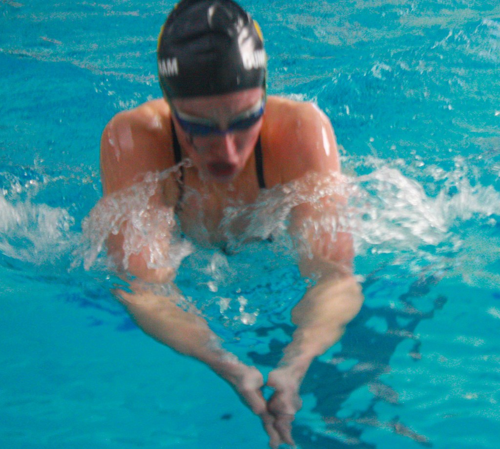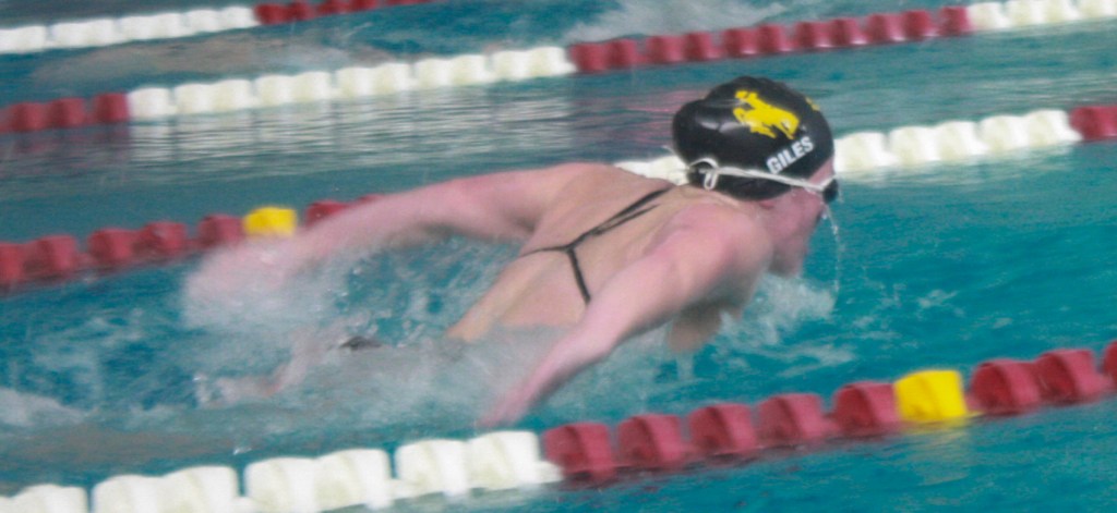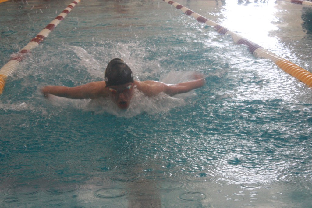 A UW swimmer competes in the butterfly event during a swimming competition at Laramie High School on October 6, 2023.