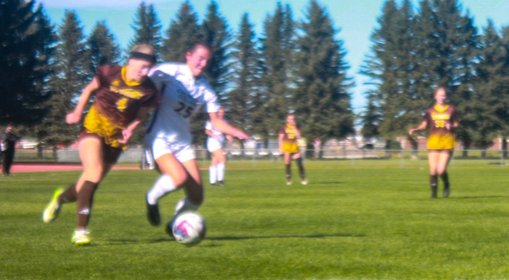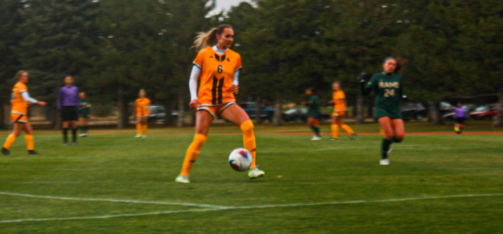 A UW soccer player competes in a soccer match against Colorado State at the Louis S. Madrid Sports Complex on October 26, 2023.